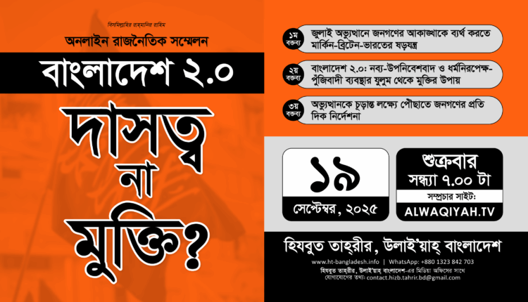 হিযবুত তাহ্রীর, উলাই‘য়াহ্ বাংলাদেশ কর্তৃক আয়োজিত “বাংলাদেশ ২.০: দাসত্ব না মুক্তি” শীর্ষক অনলাইন রাজনৈতিক সম্মেলনটি দেখার জন্য দেশের রাজনীতিবিদ, বুদ্ধিজীবি, সাংবাদিক ও তরুণ প্রজন্মসহ সকল সচেতন জনগণকে আমন্ত্রণ