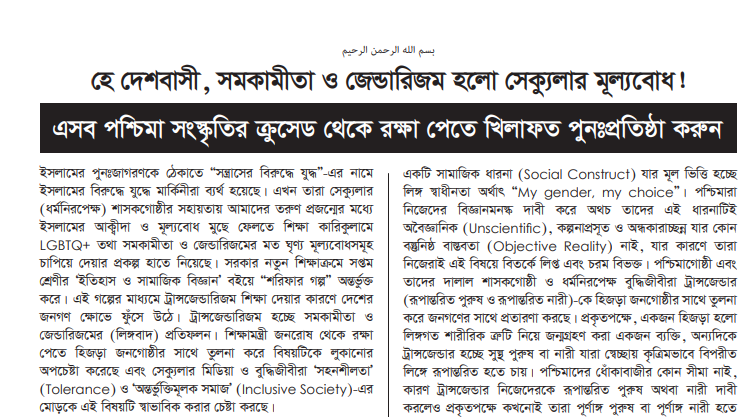 ইসলামের পুনঃজাগরণকে ঠেকাতে “সন্ত্রাসের বিরুদ্ধে যুদ্ধ”-এর নামে ইসলামের বিরুদ্ধে যুদ্ধে মার্কিনীরা ব্যর্থ হয়েছে। এখন তারা সেক্যুলার (ধর্মনিরপেক্ষ) শাসকগোষ্ঠীর সহায়তায় আমাদের তরুণ প্রজন্মের মধ্যে ইসলামের আক্বীদা ও মূল্যবোধ মুছে ফেলতে শিক্ষা কারিকুলামে LGBTQ+ তথা সমকামীতা ও জেন্ডারিজমের মত ঘৃণ্য মূল্যবোধসমূহ চাপিয়ে দেয়ার প্রকল্প হাতে নিয়েছে। সরকার নতুন শিক্ষাক্রমে সপ্তম শ্রেণীর ‘ইতিহাস ও সামাজিক বিজ্ঞান’বইয়ে “শরিফার গল্প” অন্তর্ভুক্ত করে। এই গল্পের মাধ্যমে ট্রান্সজেন্ডারিজম শিক্ষা দেয়ার কারণে দেশের জনগণ ক্ষোভে ফুঁসে উঠে। ট্রান্সজেন্ডারিজম হচ্ছে সমকামীতা ও জেন্ডারিজমের (লিঙ্গবাদ) প্রতিফলন। শিক্ষামন্ত্রী জনরোষ থেকে রক্ষা পেতে হিজড়া জনগোষ্ঠীর সাথে তুলনা করে বিষয়টিকে লুকানোর অপচেষ্টা করেছে এবং সেক্যুলার মিডিয়া ও বুদ্ধিজীবীরা ‘সহনশীলতা’ (Tolerance) ও ‘অন্তর্ভুক্তিমূলক সমাজ’ (Inclusive Society)-এর মোড়কে এই বিষয়টি স্বাভাবিক করার চেষ্টা করছে।