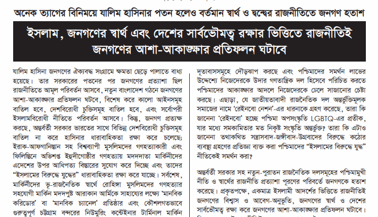যালিম হাসিনা জনগণের ঐক্যবদ্ধ সংগ্রামে ক্ষমতা ছেড়ে পালাতে বাধ্য হয়েছে। তার সরকারের পতনের পর জনগণের প্রত্যাশা ছিল রাজনীতিতে আমূল পরিবর্তন আসবে, নতুন বাংলাদেশ গঠনে জনগণের আশা-আকাঙ্ক্ষার প্রতিফলন ঘটবে, বিশেষ করে কালো আইনসমূহ বাতিল হবে, দেশবিরোধী চুক্তিসমূহ বাতিল হবে, এবং সর্বোপরী ইসলামবিরোধী নীতিতে পরিবর্তন আসবে। কিন্তু, জনগণ প্রত্যক্ষ করছে, অন্তর্বর্তী সরকার ভারতের সাথে বিভিন্ন দেশবিরোধী চুক্তিসমূহ বাতিল না করে হাসিনার ধারাবাহিকতা রক্ষা করে চলেছে; ইরাক-আফগানিস্তান সহ বিশ্বব্যাপী মুসলিমদের গণহত্যাকারী এবং ফিলিস্তিনে অভিশপ্ত ইহুদীগোষ্ঠীর গণহত্যায় মদদদাতা মার্কিনীদের এদেশের উপর আধিপত্য বিস্তারের সুযোগ করে দিচ্ছে এবং তাদের “ইসলামের বিরুদ্ধে যুদ্ধের” ধারাবাহিকতা রক্ষা করে যাচ্ছে। সর্বশেষ, মার্কির্নীদের ভূ-রাজনৈতিক স্বার্থে রোহিঙ্গা মুসলিমদের গণহত্যার সহযোগী মার্কিন মদদপুষ্ট আরাকান আর্মিকে সাহায্যের লক্ষ্যে ‘মানবিক করিডোর’ বা ‘মানবিক চ্যানেল’ প্রতিষ্ঠার এবং কৌশলগতভাবে গুরুত্বপূর্ণ চট্টগ্রাম বন্দরের নিউমুরিং কন্টেইনার টার্মিনাল মার্কিন প্রভাবাধীন কোম্পানী ‘ডিপি ওয়ার্ল্ড’-এর কাছে হস্তান্তরের উদ্যোগ গ্রহণ করেছে, যা জনগণের মধ্যে ব্যাপক ক্ষোভের সৃষ্টি করেছে।