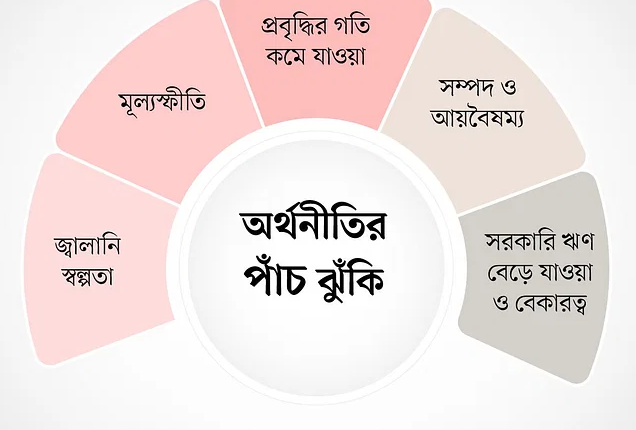 দেশের উচ্চ মূল্যস্ফীতির কারণ হলো সরকার কর্তৃক অবাধে টাকা ছাপানো ও নিত্যপ্রয়োজনীয় জিনিসপত্রের উপর কর্পোরেট নিয়ন্ত্রণকে স্থায়ী ও প্রাতিষ্ঠানিক রূপ দেওয়া, যেগুলোও পুঁজিবাদী চিন্তার ফসল। দেশের অর্থনৈতিক প্রবৃদ্ধি নিয়ে নির্বোধ পুঁজিবাদী বুদ্ধিজীবি ও রাজনীতিবিদরা অনেক মাতামাতি করলেও এটি একটি কৃত্রিম বা মেকি প্রবৃদ্ধি যা extreme-outliers দ্বারা প্রভাবিত। ফলে এই extreme-outliers গুলো যখন বিষফোঁড়া হয়ে বের হয় তখন তথাকথিত অর্থনৈতিক চক্রের (economic cycle) তত্ত্বকথা হিসেবে প্রবৃদ্ধির গতি কমবে এটাই স্বাভাবিক। এই কৃত্রিম প্রবৃদ্ধি জনজীবনে নূন্যতম অর্থনৈতিক মুক্তি বা স্বস্তি আনা দূরে থাক, তা দেশের ইতিহাসের সবচেয়ে ভয়াবহ সম্পদ ও আয়বৈষম্য তৈরী করেছে এবং জনগণকে পাহাড়সম বৈদেশিক ঋণের শিকলে আবদ্ধ করে ফেলেছে। আর সরকারী ঋণ বেড়ে যাওয়ার মূল কারণও হলো পুঁজিবাদী চিন্তাপ্রসূত ‘চিরস্থায়ী’ ঘাটতি বাজেট বাস্তবায়ন করা; এর পাশাপাশি দুর্নীতি ও স্বেচ্ছাচারী আইন তৈরী করে দায়মুক্তি-তো রয়েছেই। সুতরাং বলার অপেক্ষা রাখে না যে, দেশের অর্থনীতির দৃশ্যমান সকল ঝুঁকিগুলো হলো ‘পুঁজিবাদের’ বাচ্চাকাচ্চা।